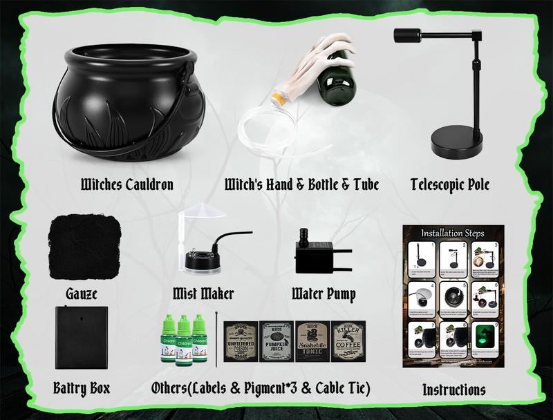 ·【Complete Halloween Kit & Easy Set Up】Includes: Plastic Witches cauldron (8"x5"), water pump, mist maker, stickers, skeleton prop + adjustable umbrella baffle. Setup in 5 minutes with video guide.