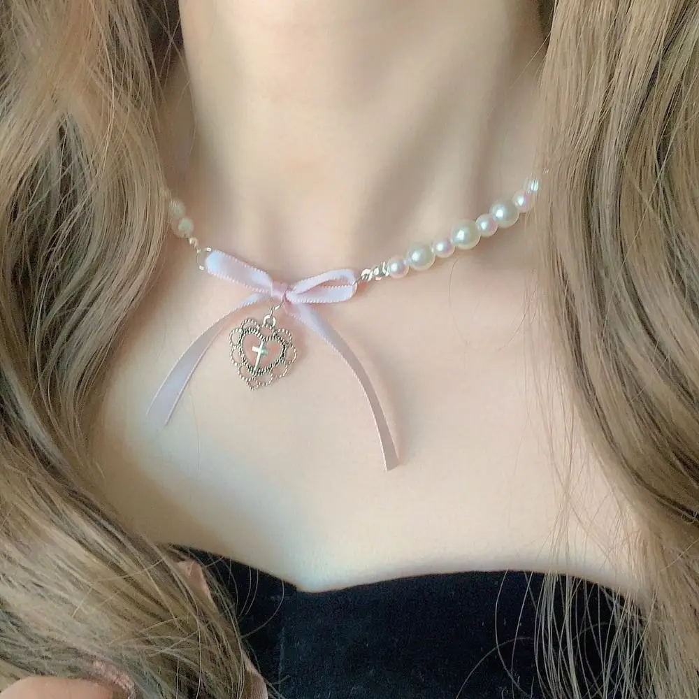 Brand New and High Quality Name:Bow Love Cross Necklace Color:pink+white Quantity:1pcs Size:As Show In Pictures Material:Metal+Pearl Weight:13g Package Included: 1 xBow Love Cross Necklace